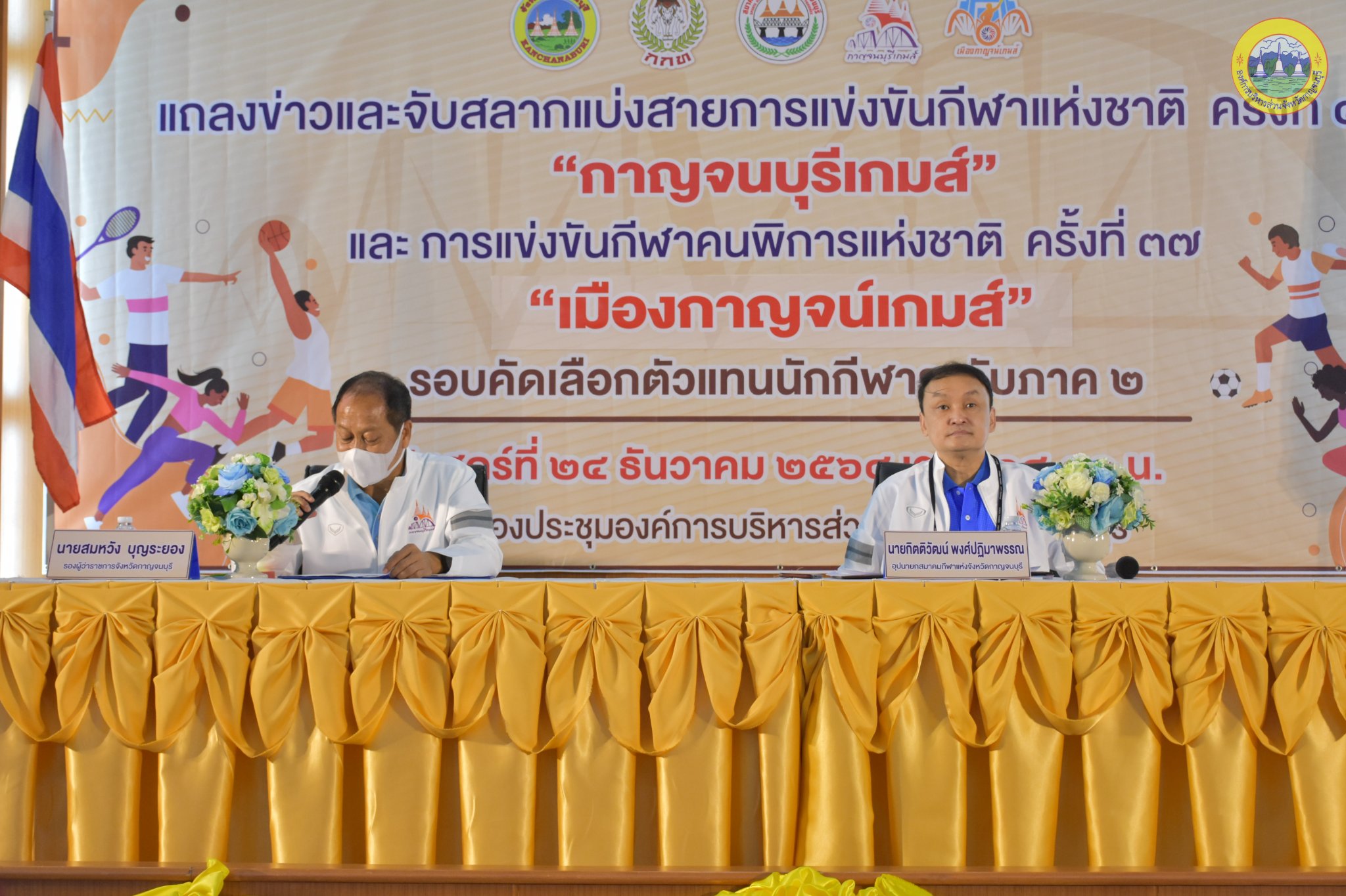 นายสุรพงษ์ ปิยะโชติ นายก อบจ.กาญจนบุรี มอบหมาย นายชูศักดิ์ แม้นทิม รองนายก อบจ.กาญจนบุรี เข้าร่วมงานแถลงข่าวและจับฉลากแบ่งสายการจัดการแข่งขันกีฬาแห่งชาติ ครั้งที่ 47 “กาญจนบุรีเกมส์” รอบคัดเลือกตัวแทนนักกีฬา ระดับภาค 2 ณ จังหวัดกาญจนบุรี โดยมีนายสมหวัง บุญระยอง รองผู้ว่าราชการจังหวัดกาญจนบุรี เป็นประธาน ฯ พร้อมทั้งจังหวัดที่เข้าร่วมการแข่งขันฯ ประกอบด้วย จังหวัดสุพรรณบุรี จังหวัดสิงห์บุรี จังหวัดประจวบคีรีขันธ์ จังหวัดลพบุรี จังหวัดอ่างทอง จังหวัดอุทัยธานี จังหวัดสระบุรี จังหวัดนครปฐม จังหวัดชัยนาท จังหวัดนครสวรรค์ จังหวัดพระนครศรีอยุธยา จังหวัดเพชรบุรี จังหวัดราชบุรี และ