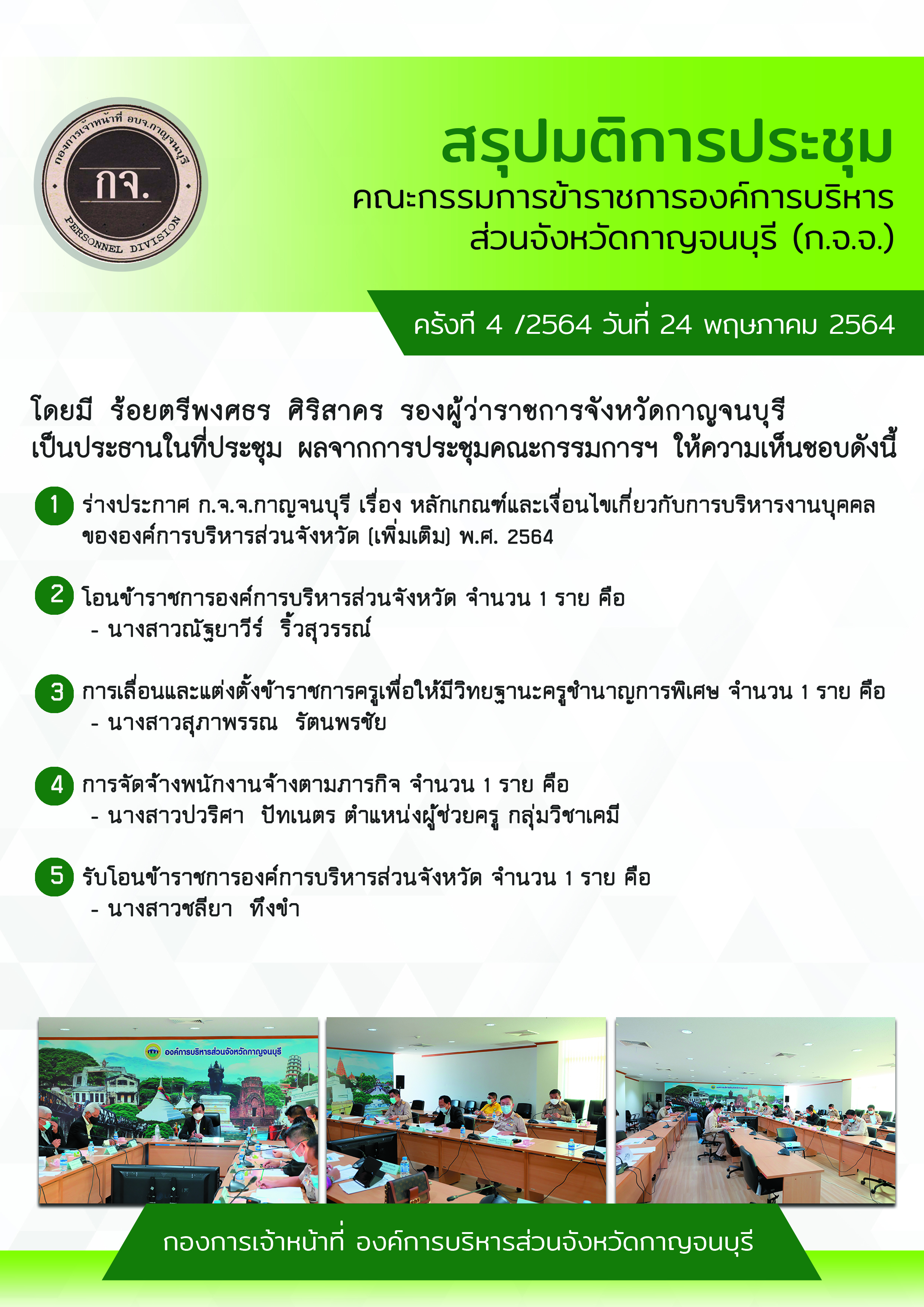 เมื่อวันที่ 24 พฤษภาคม 2564 เวลา 13.30 น. มีการประชุม ก.จ.จ.กาญจนบุรี ครั้งที่ 4/2564