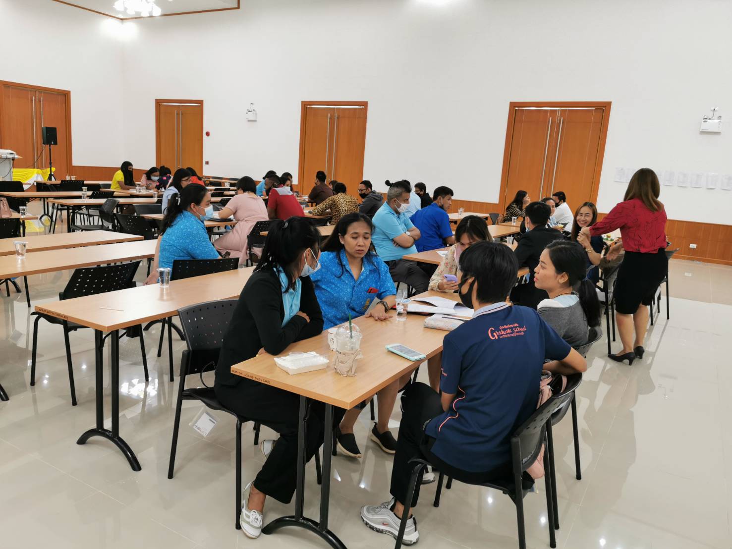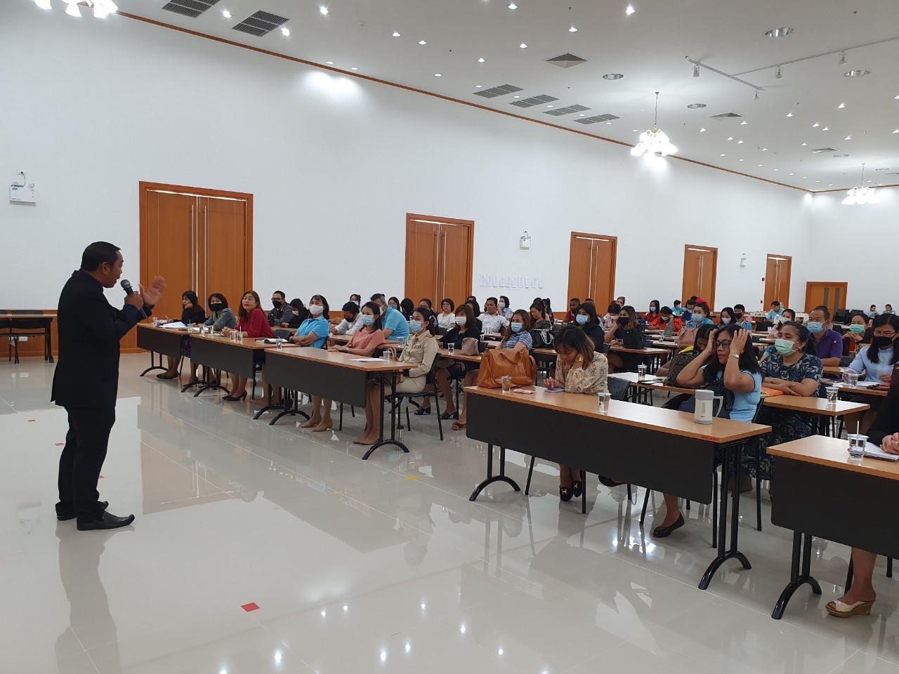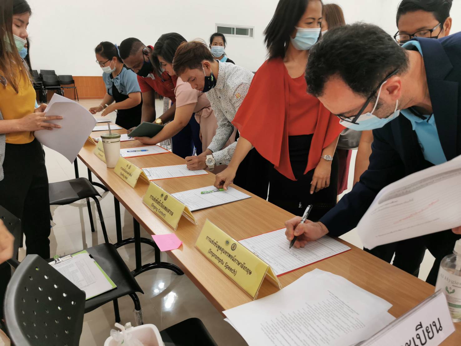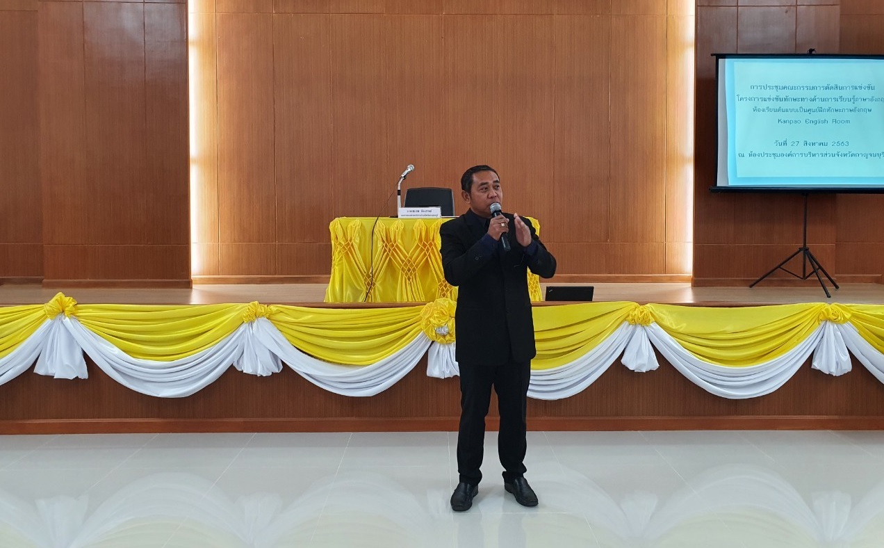 นายรังสรรค์ รัศมีฤกษ์เศรษฐ์ นายกอบจ.กาญจนบุรี พร้อมด้วย นายอัครวัฒน์ ศิริธัญญ์ธนากร รองปลัดอบจ.กาญจนบุรี รักษาราชการแทน ผู้อำนวยการกองการศึกษา ศาสนาและวัฒนธรรม ได้กล่าวต้อนรับคณะกรรมการตัดสินการแข่งขันเพื่อสร้างแบบทดสอบ โครงการแข่งขันทักษะทางด้านการเรียนรู้ภาษาอังกฤษห้องเรียนต้อนแบบเป็นศูนย์ฝึกทักษะภาษาอังกฤษ Kanpao English Room