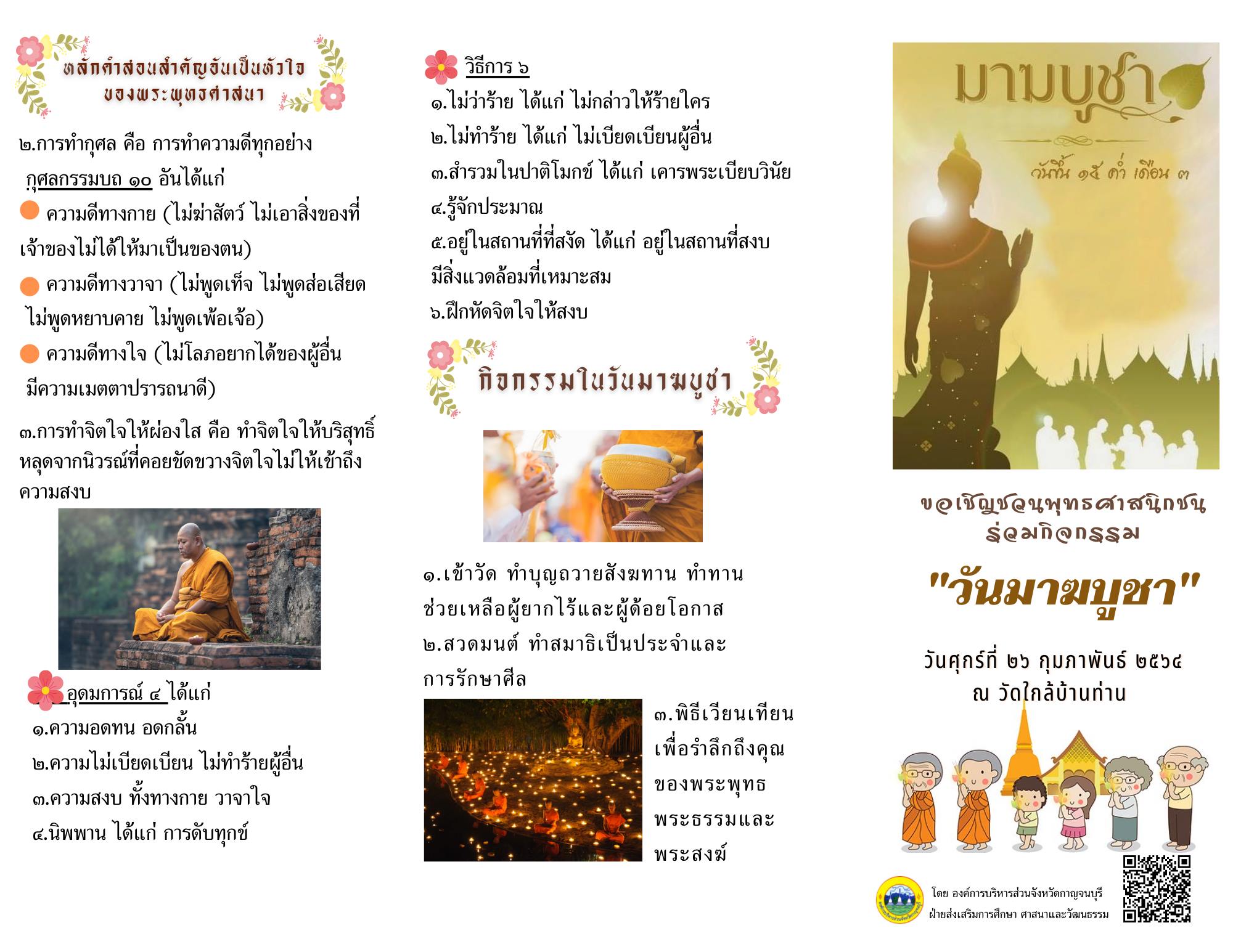 ด้วยวันที่ 26 กุมภาพันธ์ 2564 ตรงกับ "วันมาฆบูชา" ซึ่งเป็นวันสำคัญวันหนึ่งของพระพุทธศาสนา เป็นวันที่พระสัมมาสัมพุทธเจ้าทรงแสดง "โอวาทปาฏิโมกข์" แก่พระสงฆ์เป็นครั้งแรก ซึ่งหลักคำสอนนี้เป็นหลักการและวิธีการปฏิบัติต่าง ๆ หากสรุปเป็นใจความสำคัญว่า "ทำความดี ละเว้นความชั่ว ทำจิตใจให้บริสุทธิ์" การปฏิบัติตนสำหรับพุทธศาสนิกชนในวันมาฆบูชา คือ ในตอนเช้า ควรไปทำบุญตักบาตร ไปวัดเพื่อฟังพระธรรมเทศนา หรือจัดสำรับคาวหวานไปทำบุญถวายภัตตาหาร ช่วงบ่ายฟังพระแสดงพระธรรมเทศนา เจริญสมาธิภาวนา เมื่อถึงตอนค่ำ นำดอกไม้ ธูปเทียนไปเวียนเทียน 3 รอบที่พระอุโบสถ โดยการเวียนเทียนนั้นจะเวียนขวา จำนวน 3 รอบ และช่วงเวลาที่เดินอยู่นั้นให้ระลึกถึง พระพุทธ พระธรรม พระสงฆ์