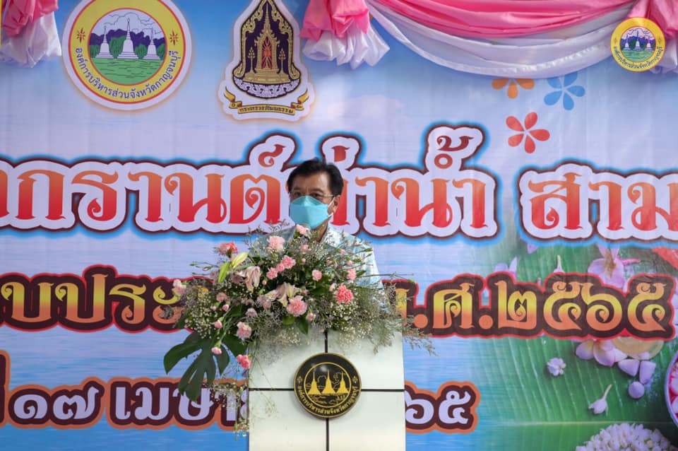 วันอาทิตย์ที่ 17 เมษายน 2565 เวลา 16.00 น. นายสุรพงษ์ ปิยะโชติ นายกองค์การบริหารส่วนจังหวัดกาญจนบุรี กล่าวรายงานวัตถุประสงค์ของการจัดโครงการสงกรานต์ท่าน้ำ สามสาย ประจำปีงบประมาณ พ.ศ. 2565 โดยการจัดงานครั้งนี้ องค์การบริหารส่วนจังหวัดกาญจนบุรี ร่วมกับ สำนักงานวัฒนธรรมจังหวัดกาญจนบุรี จัดขึ้นเพื่อสืบสานประเพณีวัฒนธรรม โดยมี นายกองเอก พงศธร ศิริสาคร   รองผู้ว่าราชการจังหวัดกาญจนบุรี เป็นประธานกล่าวเปิดงาน ฯ ซึ่งภายในงานได้มีการแห่ริ้วขบวนบุปผชาติอันวิจิตรงดงาม ทั้ง 13 อำเภอ มีพิธีสรงน้ำพระแบบไทย และสรงน้ำพระผ่านลำไม้ไผ่แบบชาวไทยเชื้อสายมอญ อีกทั้งยังมีการแสดงศิลปวัฒนธรรมที่คงความเป็นพื้นบ้านของชาวจังหวัดกาญจนบุรี ณ วัดเทวสังฆาราม (วัดเหนือ) อำเภอเมืองกาญจนบุรี จังหวัดกาญจนบุรี