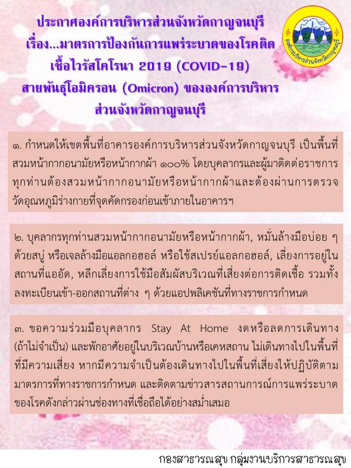 ประกาศองค์การบริหารส่วนจังหวัดกาญจนบุรี เรื่อง มาตรการป้องกันการแพร่ระบาดของโรคโควิด-19 สายพันธุ์โอมิครอน (Omicron) ขององค์การบริหารส่วนจังหวัดกาญจนบุรี